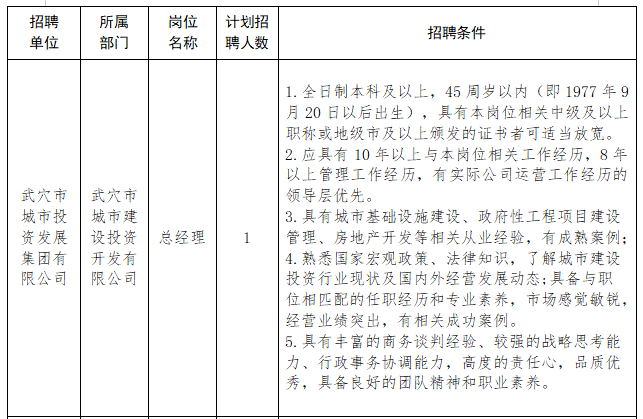 為深入貫徹國企改革三年行動(dòng)工作部署,深化選人用人機(jī)制改革,完善武穴市城市投資發(fā)展集團(tuán)有限公司管理梯隊(duì),特面向社會(huì)公開招聘職業(yè)經(jīng)理人3名,現(xiàn)將相關(guān)事項(xiàng)公告如下:
